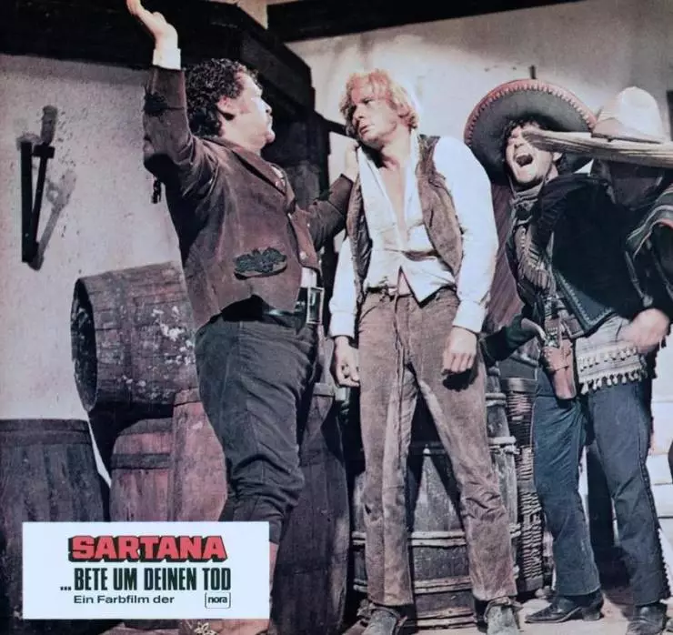Фильм Если встретился с Сартаной, молись о смерти 1968 позволяет узнать развитие главных событий: Дилижанс, перевозящий золотой груз, атакован бандитами. Но само золото таинственным образом исчезает. А в городе появляется загадочный странник в чёрном, чьё появление, очевидно, как-то связано с пропавшим грузом......